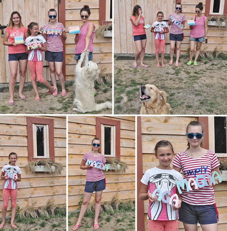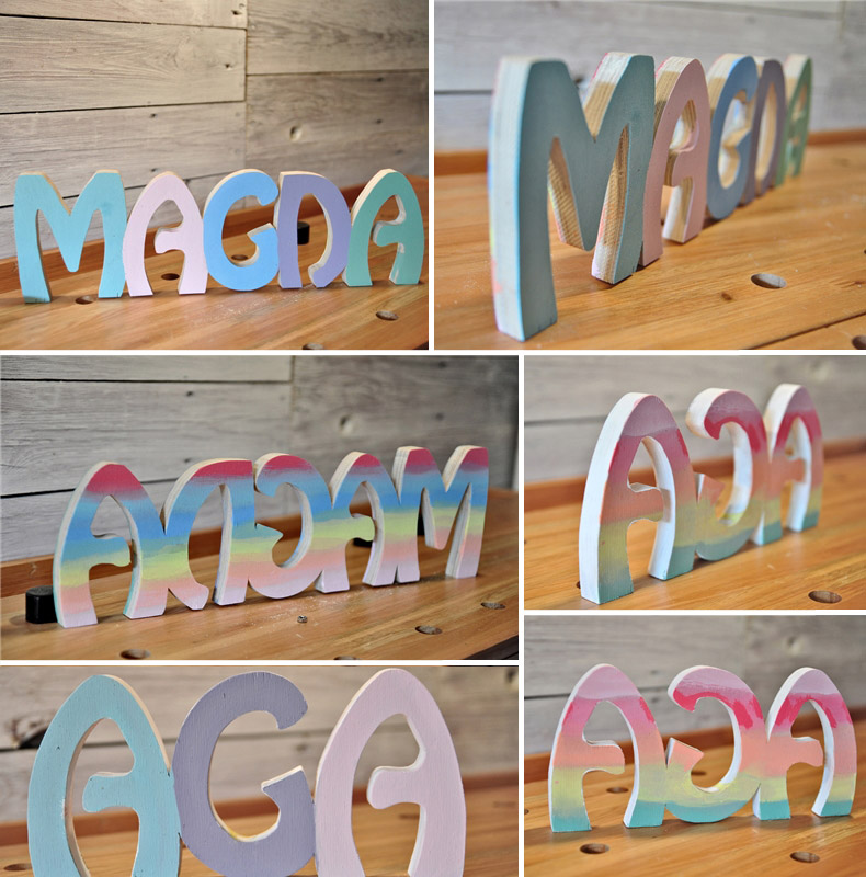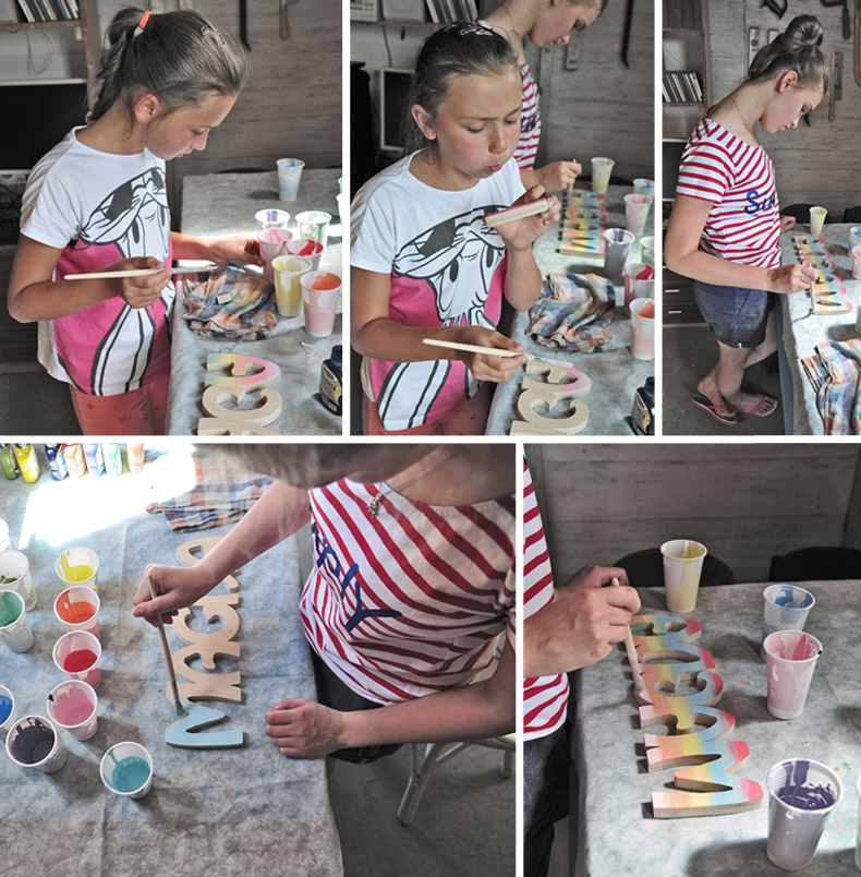 ...na bazie białej farby akrylowej za pomocą pigmentów, Asia przygotowała całą paletę pastelowych kolorów, którymi Aga i Magda pomalowały swoje literki, a rodzice dzielnie je wspomagali...