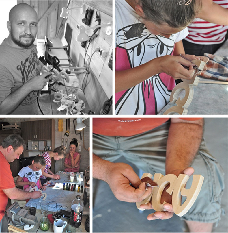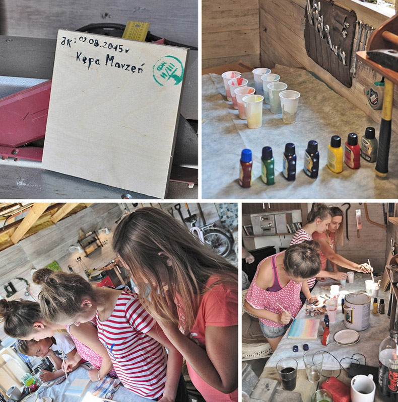 Oprócz malowniczego spływu kajakowego Pilicą, postanowiliśmy zorganizować rodzinne warsztaty DIY, ponieważ chcielismy się podzielić Naszą pasją. Wszyscy tworzyli "wycinanki" z drewnianej sklejki. Dziewczynką przygotowaliśmy imiona, które potem samodzielnie ozdobiły...