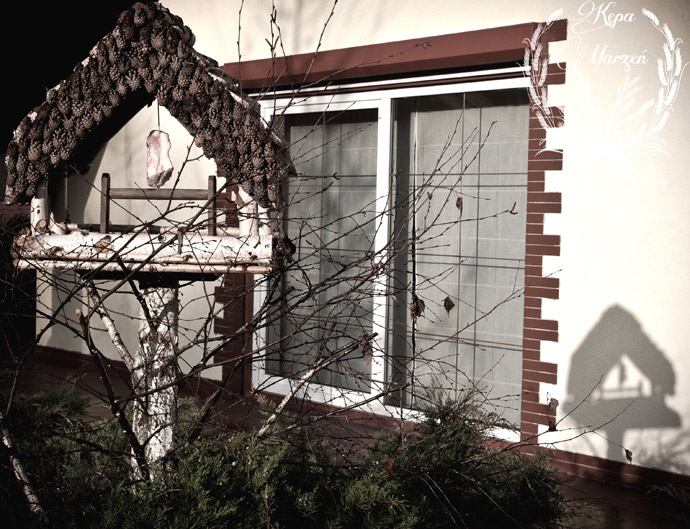 Muszę przyznać, że kiedy przenosiłem karmnik z warsztatu, do miejsca docelowego, troszkę sie spociłem:). Okazało się, że karmnik sporo waży. Pomyślałem jednak, że będzie to jego zaletą, podczas mocniejszych wiatrów. I tak oto wygląda efekt mojej zabawy w boba budowniczego:). Duży co?:) Chyba przesadziłem?:) Najlepszym komentarzem dotyczącym rozmiaru karmnika, było pytanie Asi i Znajomych: "Przemek ten karmnik to zrobiłeś dla bocianów, czy żurawie mają tu lądować:):):)