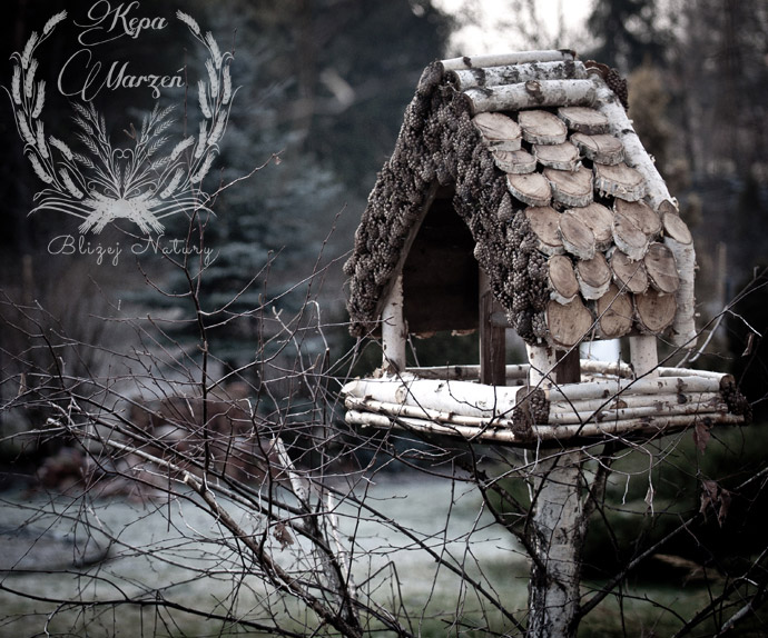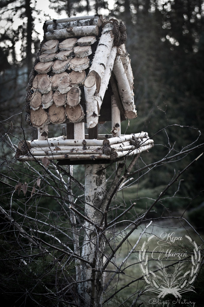 Dlaczego brzózkę? Bo chciałem, żeby karmnik stanął w towarzystwie wcześniej wspomnianych brzóz i dlatego pomyślałem, że budka z takiego właśnie drzewa będzie pasowała. Pień brzózki, który jest stojakiem dla karmnika posiadał naturalnie odrastające na boki gałęzie, których nie usunąłem. Stwierdziłem, że w ten sposób zachowam bardziej naturalistyczny wygląd, który będzie się wpisywał w krajobraz ogrodu i będzie bardziej przyjazny ptakom. Pracę zacząłem od zrobienia karmnika, zanim przymocowałem go do stojaka. Do wykonania jego podstawy wykorzystałem dwie deski. Balustradę wokół podstawy i krokiewki, zrobiłem z węższej części pnia brzózki. Konstrukcję dachu wykonałem ze starego, drewnianego pojemnika do noszenia sadzonek, który dostałem w prezencie od miejscowego leśniczego (dzięki Krzysiek:) Dach został pokryty gontem z plasterków, uzyskanych z pozostałej części brzózki. Dla urozmaicenia wyglądu dodałem jeszcze od frontu karmnika szyszki. W środku zamocowałem stojak drewniany, wykorzystując do tego uchwyt pojemnika na sadzonki. Do tego zamocowałem drut, na którym można wieszać np. słoninkę czy surowy boczek. Na końcu podstawę przykręciłem do karmnika.